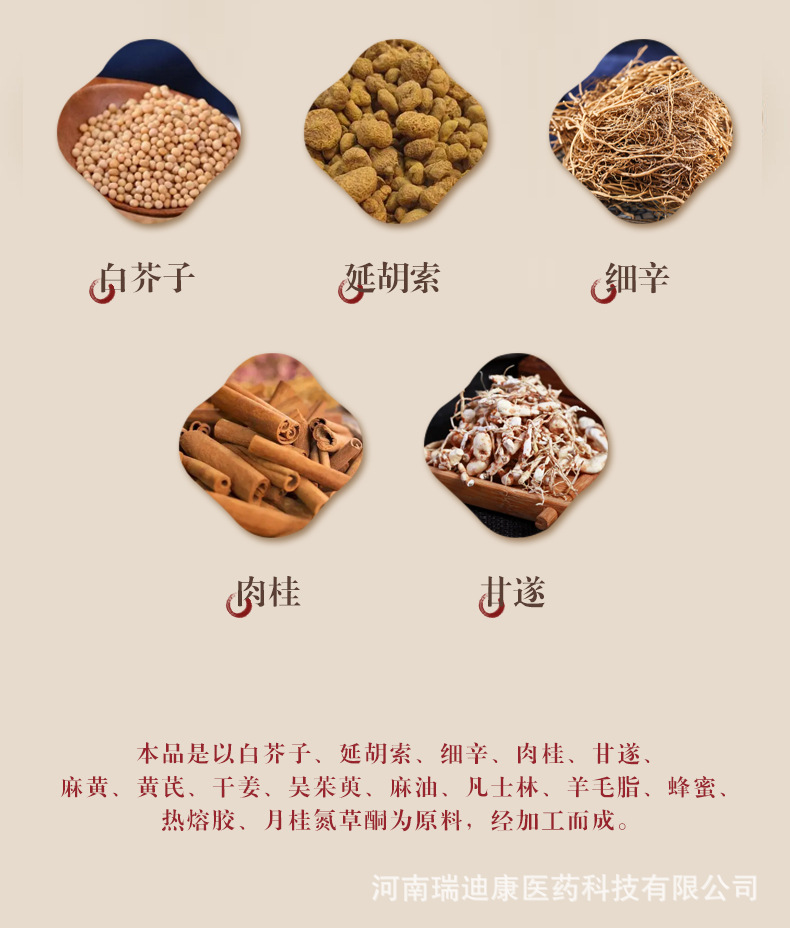 艾灸保健贴[产品名称]艾灸保健贴[产品说明]本品是以艾叶、红花、元胡、细辛、川芎、白芷、白芥子、甘遂、干姜、热熔胶、蜂蜡、樟脑、冰片、薄荷脑、辣椒油、冬青油、月桂氮䓬酮为原料,经加工而成。[保健作用]缓解各部位关节疼痛,暖宫驱寒,促进健康。[适宜人群]适宜于颈、肩、腰、腿痛,胃寒,女...